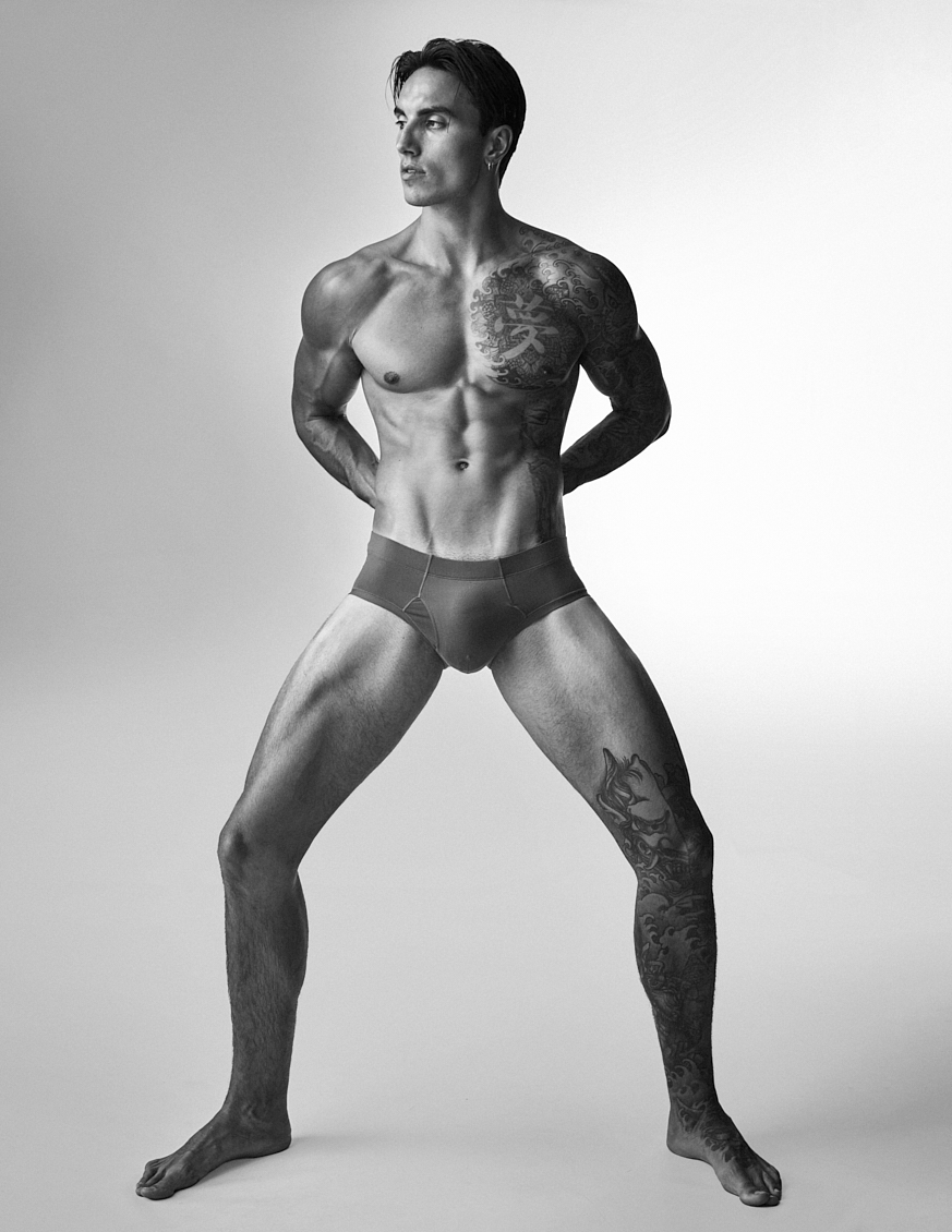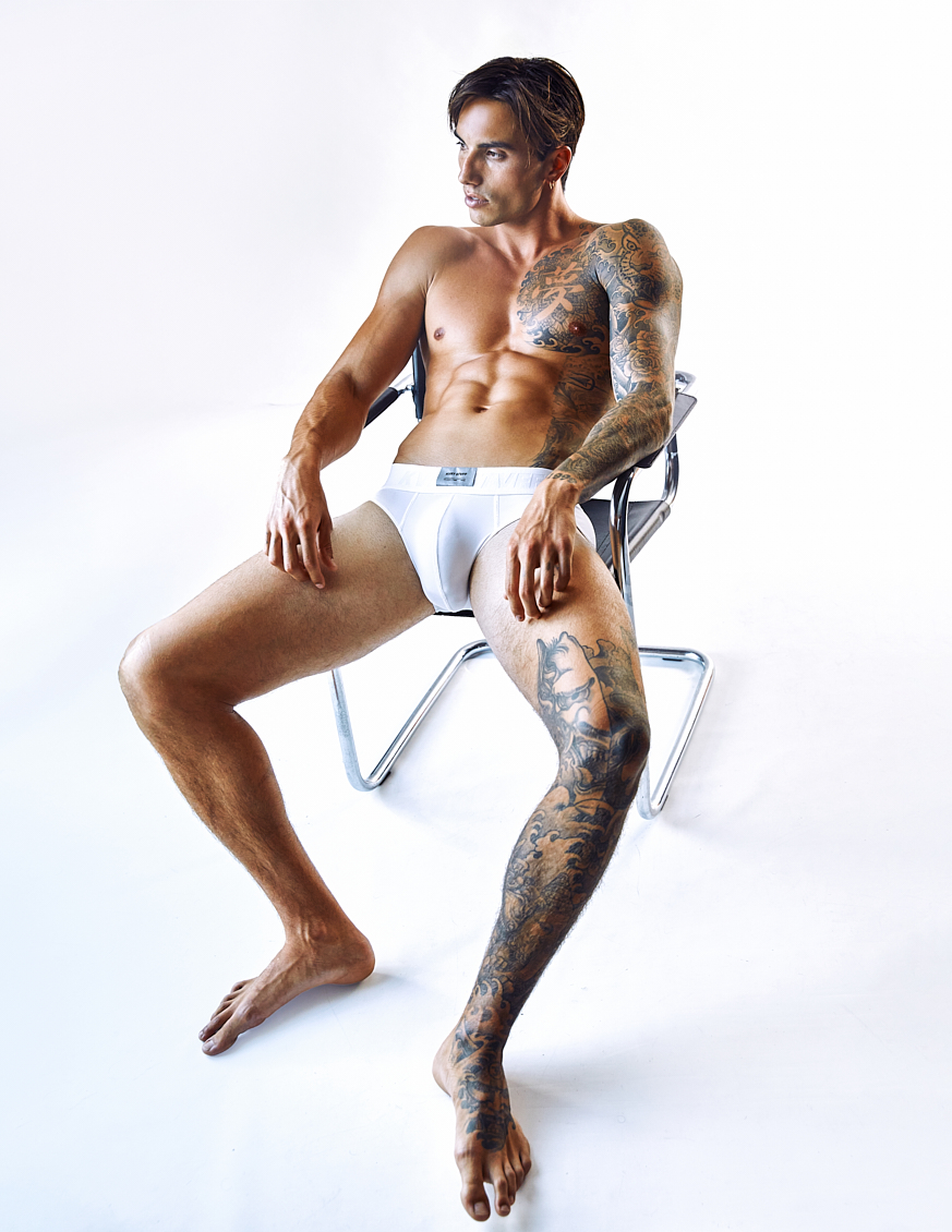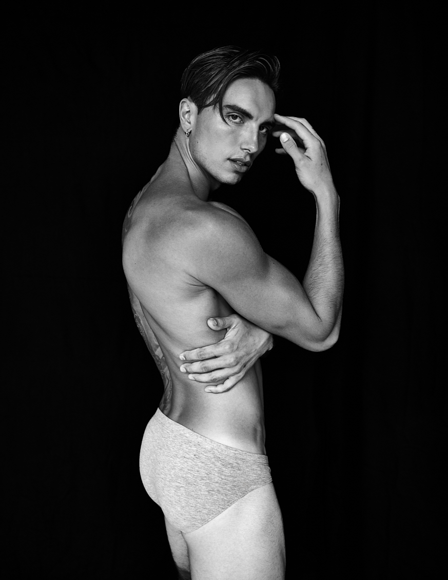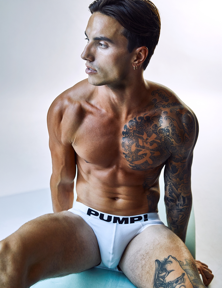 Natal Masero at Two Management photographed by Ferran Casanova and styled by Cristian Betancurt. Natal wears KVRT STUFF, Prisma, Buddy, Summy Menswear and Pump Underwear.