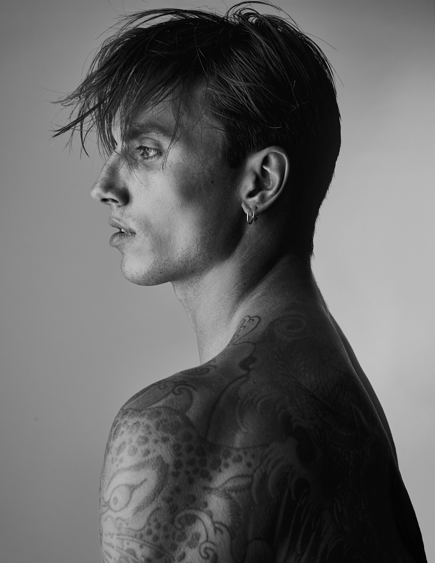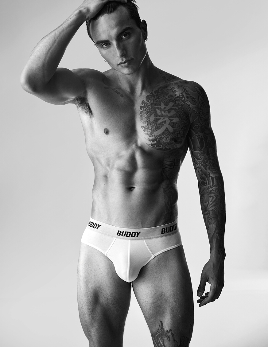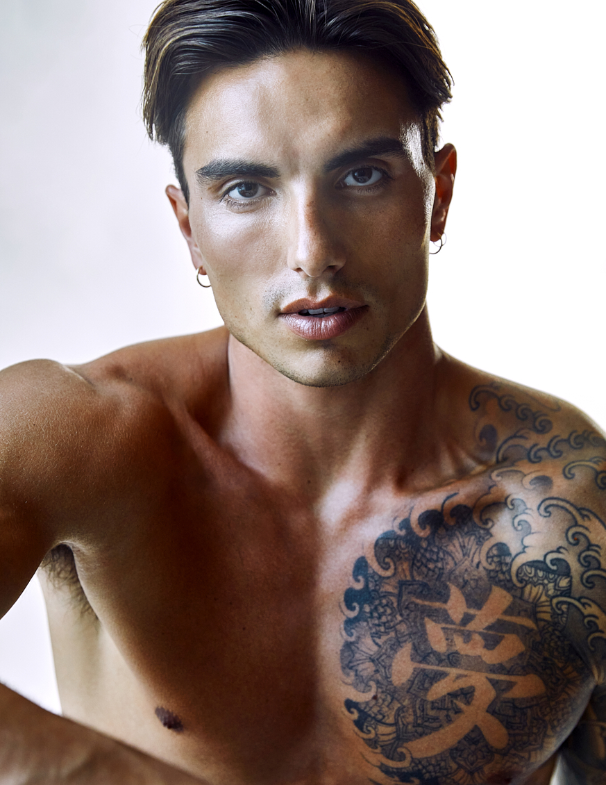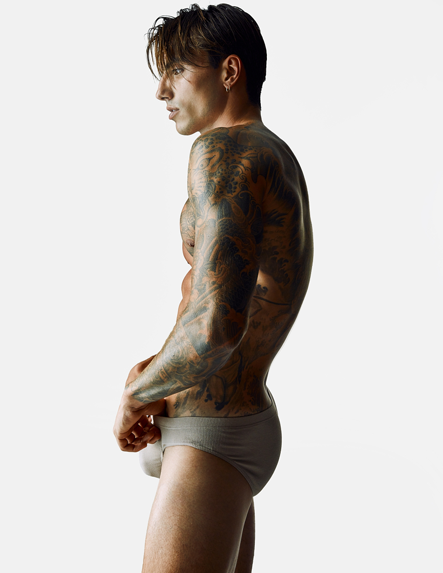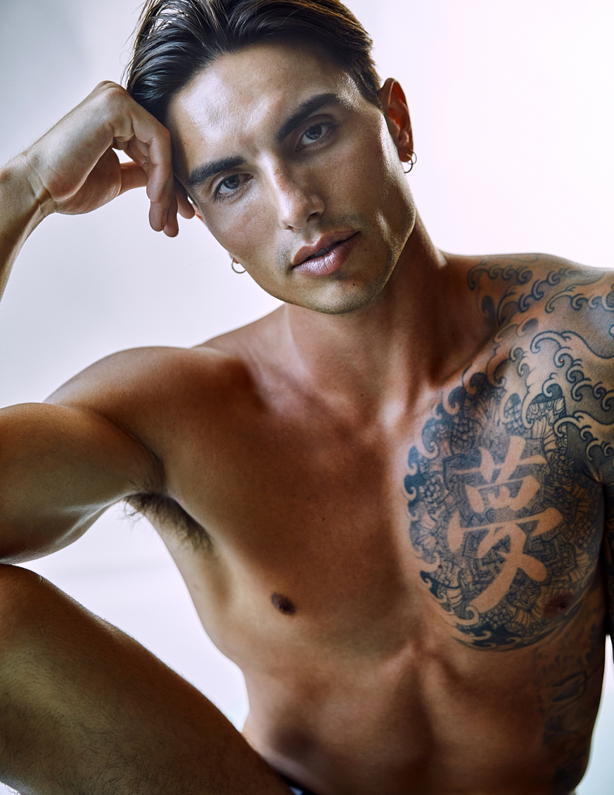 Natal Masero at Two Management photographed by Ferran Casanova and styled by Cristian Betancurt. Natal wears KVRT STUFF, Prisma, Buddy, Summy Menswear and Pump Underwear.